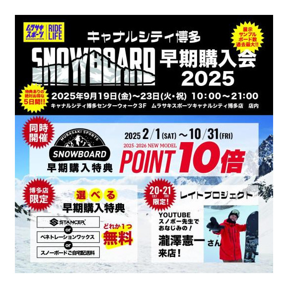 在附近店铺MURASAKI SPORTS博多运河城店,将举办滑雪板早期购买会2025。