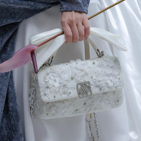 纤细的3D花和线珠梦幻般优雅的浪漫襟翼挎包。